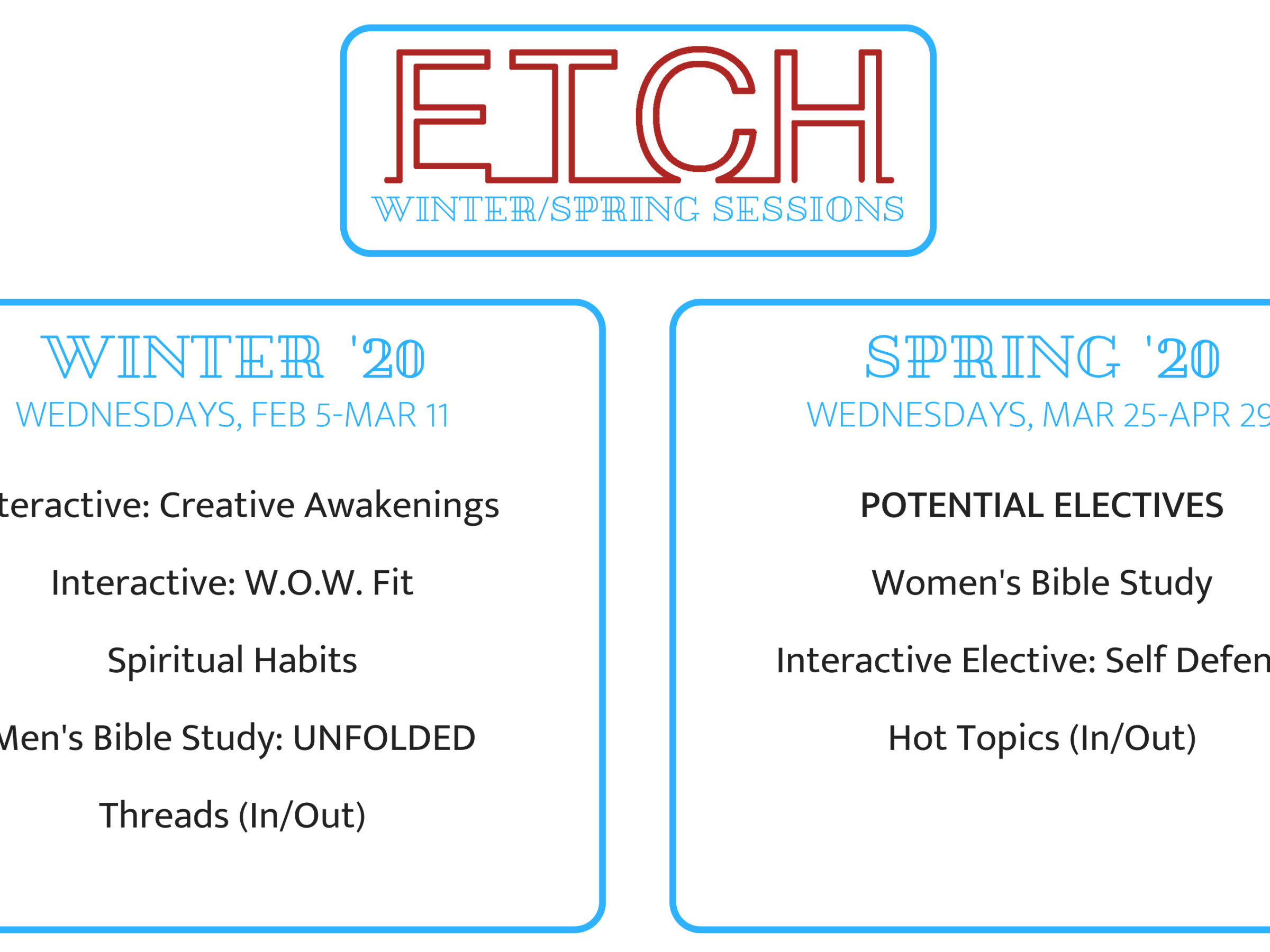 The deadline to register for the 2nd Session of Etch Electives is this coming Sunday (Feb. 25). At this point, if you register for the Women’s Bible Study then you will not receive your book by the first week. If you’d like to know… Continue Reading “Etch Electives Registration Deadline”